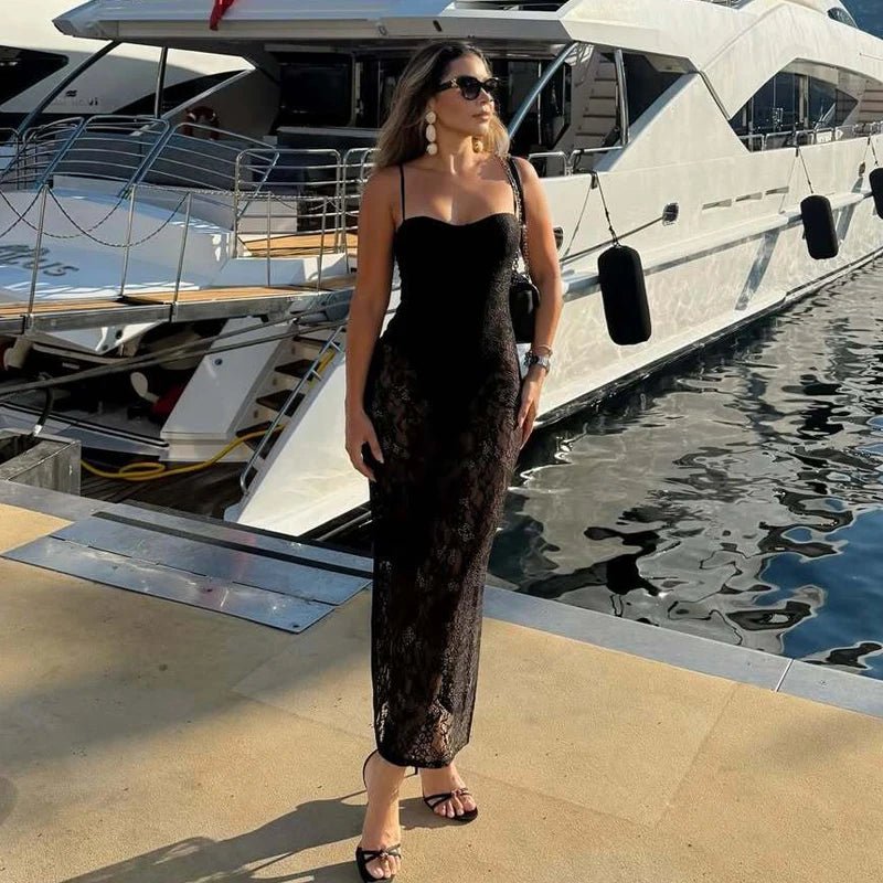 Embrace evening sophistication with this sleek mid-calf camisole dress, featuring a classic sweetheart neckline and delicate spaghetti straps. The architectural H-line silhouette is elevated by intricate lace paneling that creates a refined "bud" silhouette, blending sheer textures with a smooth satin finish. Designed with a natural waistline and a secure zipper closure, this slim-fit piece offers a timeless, minimalist aesthetic for summer soirées.