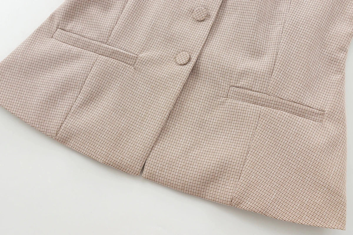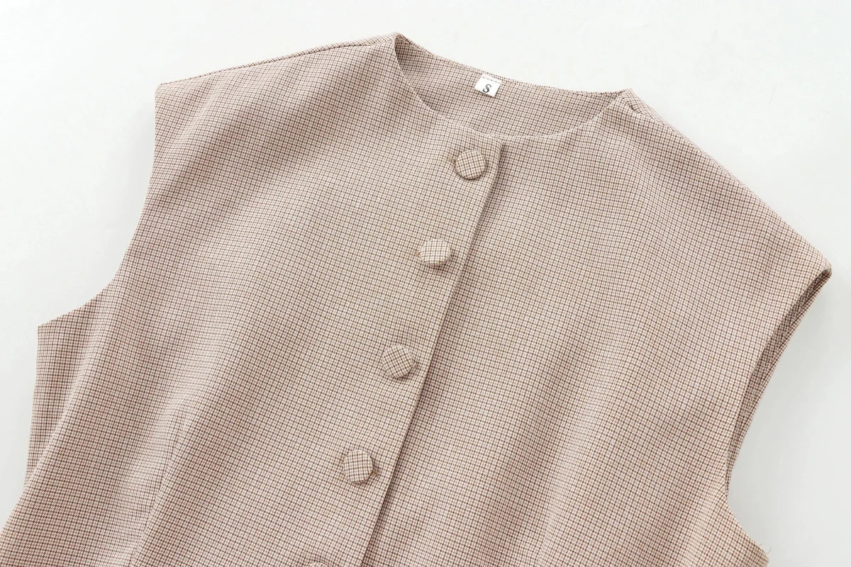 Elevate your professional wardrobe with this structured sleeveless vest, featuring a sophisticated O-neck collar and a subtle peplum hem. The architectural single-breasted front is adorned with tonal buttons and delicate welt pocket details, offering a refined "Office Lady" aesthetic. Crafted from a premium plaid-patterned weave, this piece provides a statuesque silhouette that balances classic tailoring with modern minimalist charm.