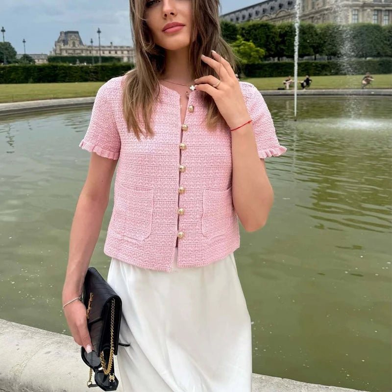 Elevate your seasonal wardrobe with this exquisitely textured short-sleeve cardigan from Faslune. Featuring a sophisticated O-neckline and ornate gold-tone buttons, this piece masterfully blends vintage charm with a modern A-straight silhouette. The extra-heavy knit fabric provides a structured yet breathable feel, making it an essential layer for refined summer elegance.