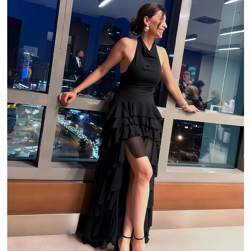 Make a dramatic statement with this breathtaking tiered maxi dress from Faslune. Designed with a sophisticated high-neck halter and a daring backless profile, it features cascading ruffles that create beautiful movement and texture. The high-low hemline adds a modern, red-carpet edge to the classic "H" profile, making it the ultimate showstopper for Summer 2026 gala events or upscale club nights.